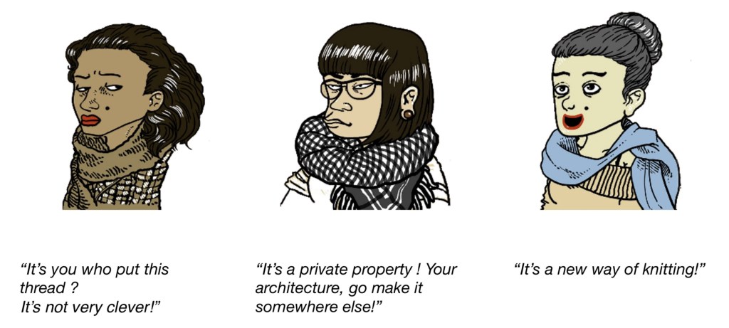 Performeurs et documentants, les étudiants suscitent des réactions à double tranchant « Être habillée tout en rouge, et dérouler 1KM de fil dans Drancy, c’était pas évident, mais quand on se détache des regards, et des réflexions, on se rend vite compte que c’est une expérience incroyable. » Corbeau (Drancy). L’Aigle (Poissy) renchérit : « De nombreux cambriolages ayant lieu dans le quartier en ce moment, les gens sont méfiants et tirer un fil rouge sur 1km peut paraître louche »