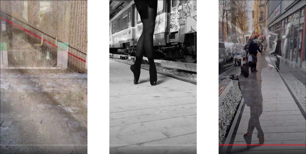 Le groupe Flamant rose a voyagé dans le temps par la danse, accrochant le fil de la gare RER de Cité Internationale à celle, désaffectée de la Petite Ceinture, dualité traduite par le photomontage et la vidéo. « Le fil rouge, métaphore d’un flux continu qui se fraye un chemin dans la frénésie de la rue » Flamant rose