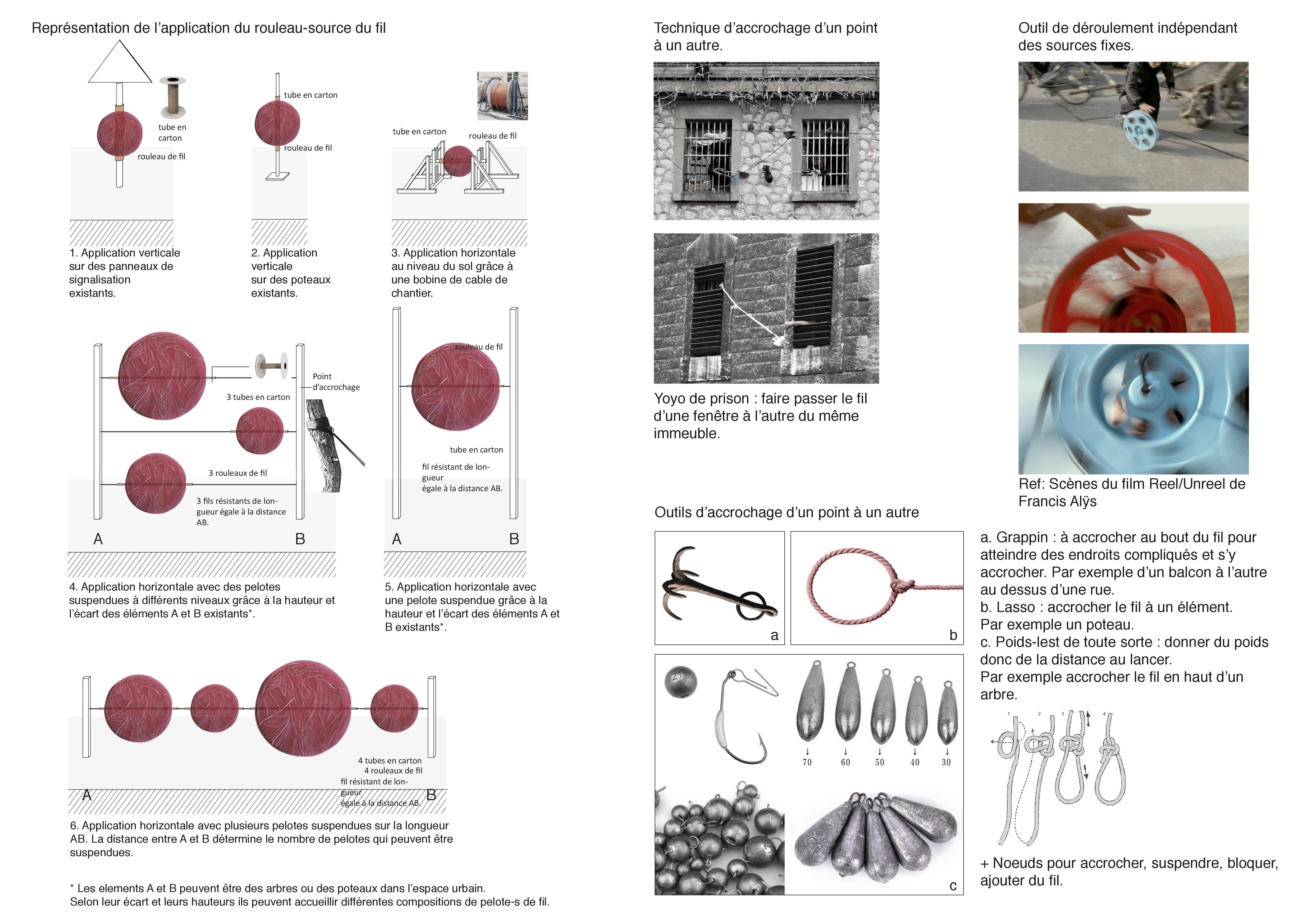 Il s’agira de multiples fils que nous déroulerons. Nous les ferons passer par des espaces publics à l’aide d’éléments urbains comme des poteaux, des arbres, des bancs. Et, avec l’accord des habitants, ils pourront pénétrer des espaces privés comme des balcons, de fenêtres, voire l’intérieur des habitations. Les scénarios seront spontanés et dépendront des réactions locales.