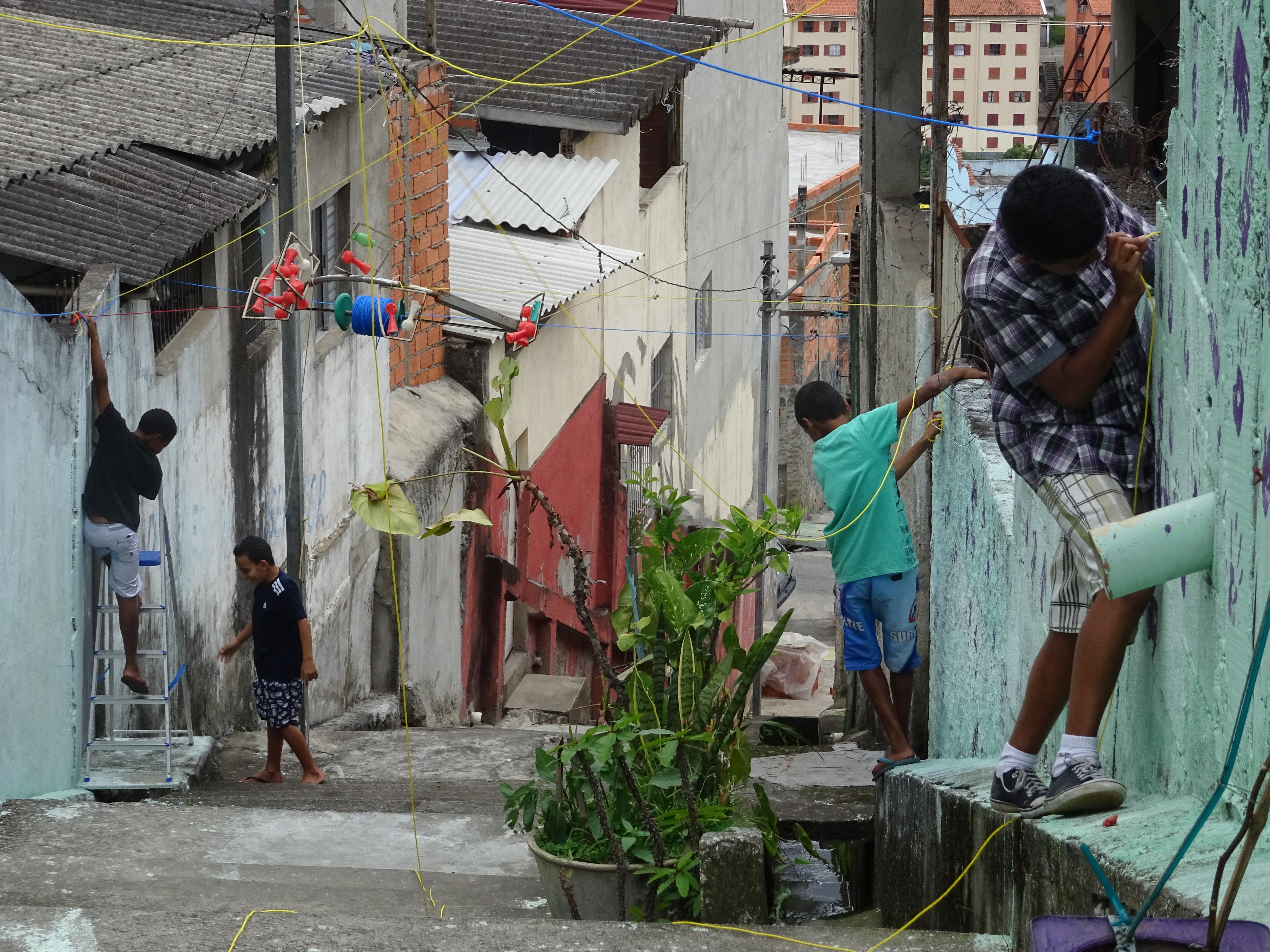 Photo: in the ex-favela Brasilândia, the appropriation of the set-up is vibrant and collective, the passers-by are all neighbors. The threads pass through all the elements of the staircases (holes in the walls, rods, cables…) as well as above the walls in the terraces, from public space to private spaces.