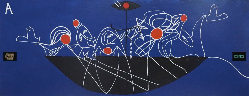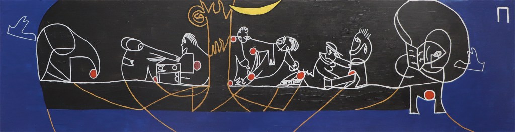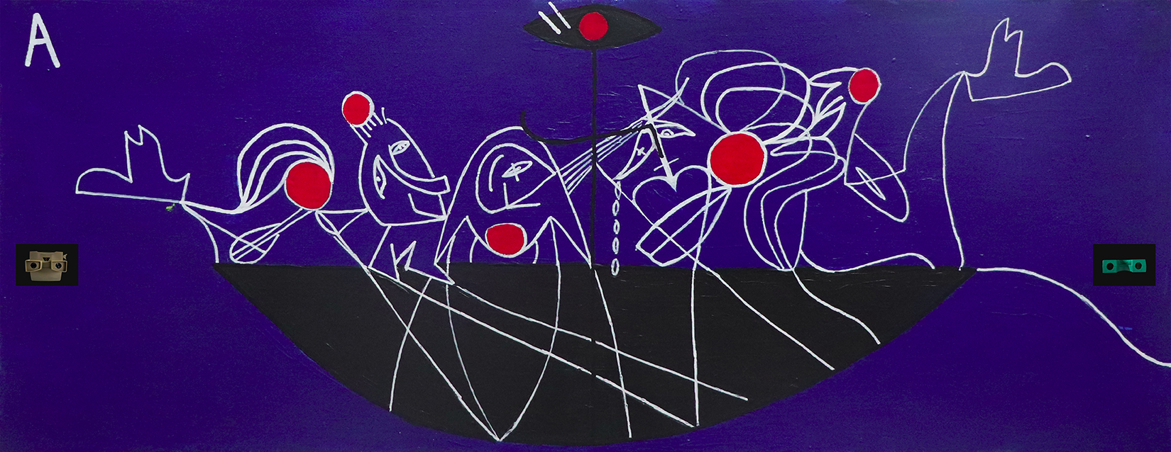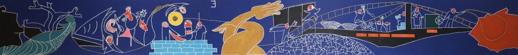 Both banks hybridise through symbols, dance and a ceremony of Care with on the left the solidarity/leprous side and on the right the treatment/doctor’s side. The lepers are cured both from the disease and the stigma (no more red circles). They become a model of mutual aid. We also hybridize shapes, colours and symbols, for example the circle became joyfully yellow, like the moon of the previous wall.