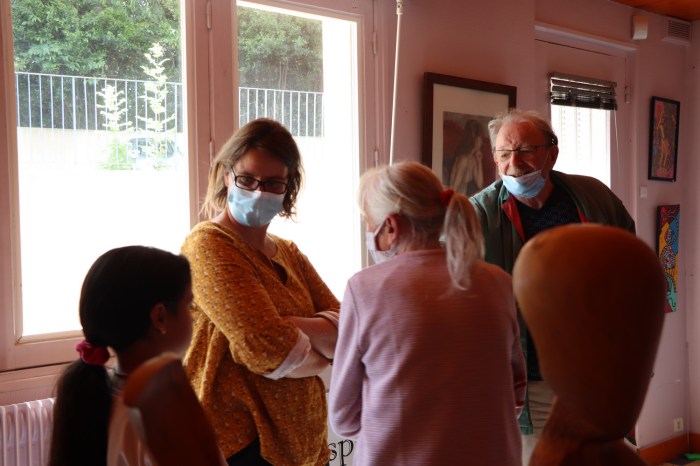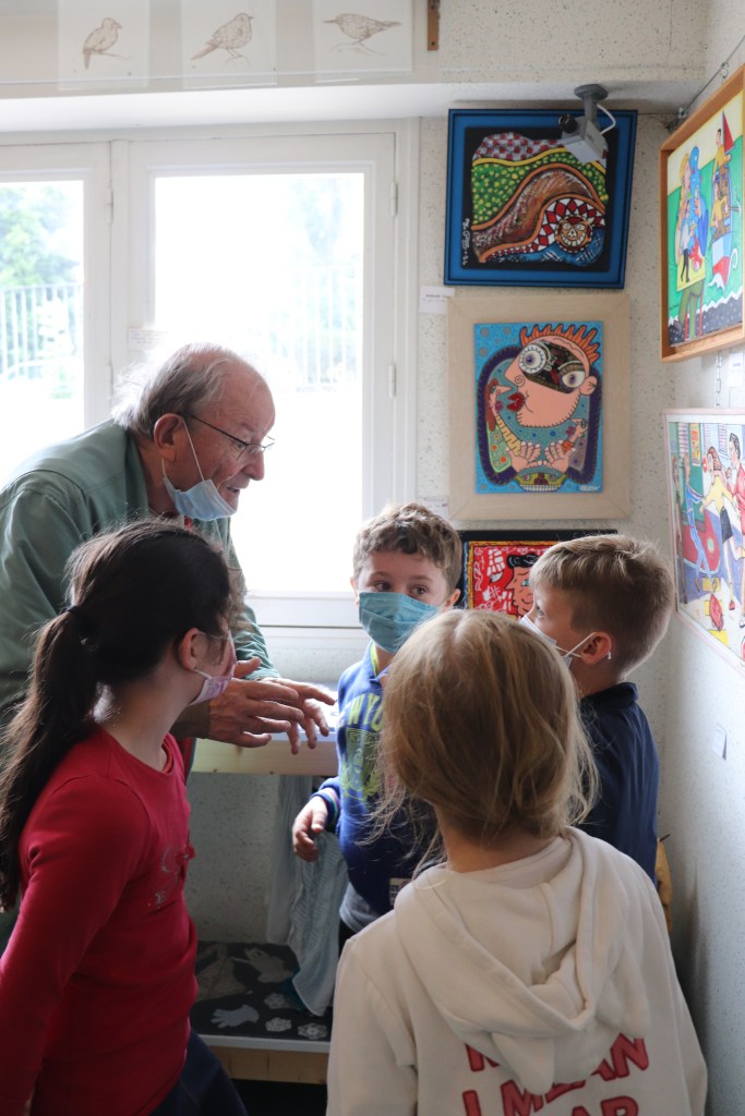 Premier temps : Visite guidée par Alain Guyomard, président de Réanim’art. M. Guyomard retrace devant chaque groupe son parcours d’amateur d’art. Il explique ses principes : « Un tableau s’achète avec les yeux, pas avec les oreilles », « Chacun a un regard et une faculté d’émotion, c’est ce qui compte dans l’art. ». « Au lycée, je ne savais pas dessiner. On n’a pas besoin de savoir dessiner pour aimer l’art ni pour être artiste » soutient-il dans la salle d’Art brut.