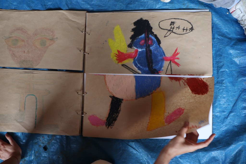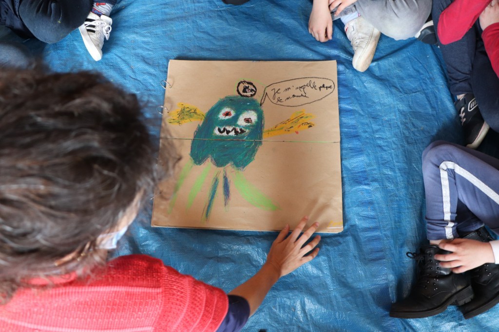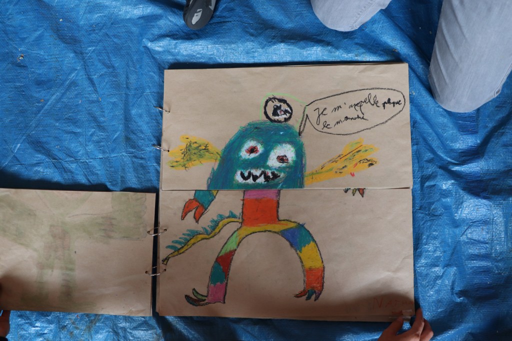 Deuxième temps : Dessins et combinaisons de monstres. Chaque participant imagine librement un monstre et le couche au pastel sur papier. Certains restent proches de la forme humaine, d’autres reproduisent un tableau, la majorité invente formes et histoires. Nous recueillons dessins et histoires dans un livre où les dessins sont séparés en deux parties afin de permettre des permutations de tête-corps. Cette technique d’assemblage de deux dessins, inspirée du cadavre exquis surréaliste, permet d’amorcer le caractère collectif de l’atelier tout en faisant jaillir des formes originales.