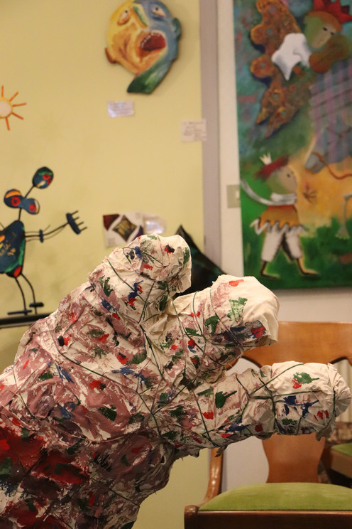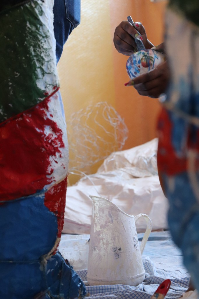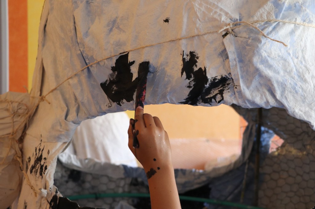 Troisième temps : Sculpture des monstres. Les quatre combinaisons choisies sont créées en groupe où chacun touche à chaque étape. D’abord, la forme est donnée par du grillage métallique semi-rigide (dit « grillage à poules »), qui est ensuite recouvert de tissu trempé dans du plâtre. Sec, le plâtre rigidifie le tissu, qui est alors peint.