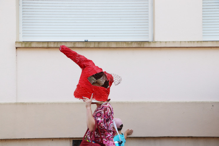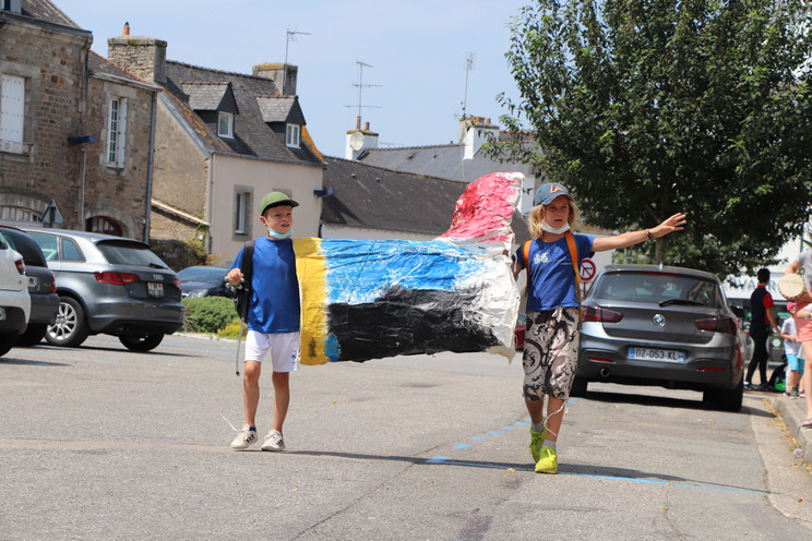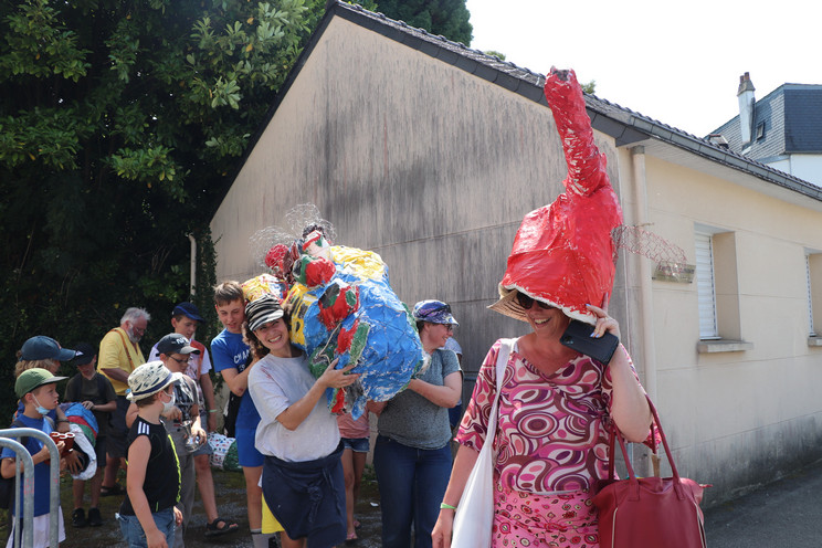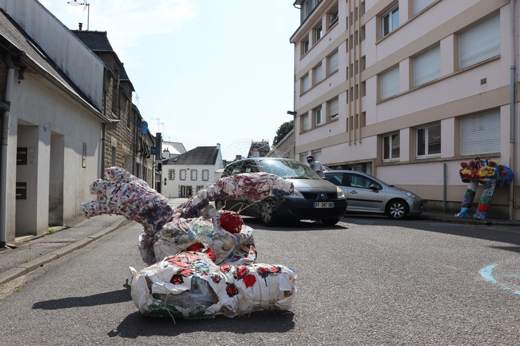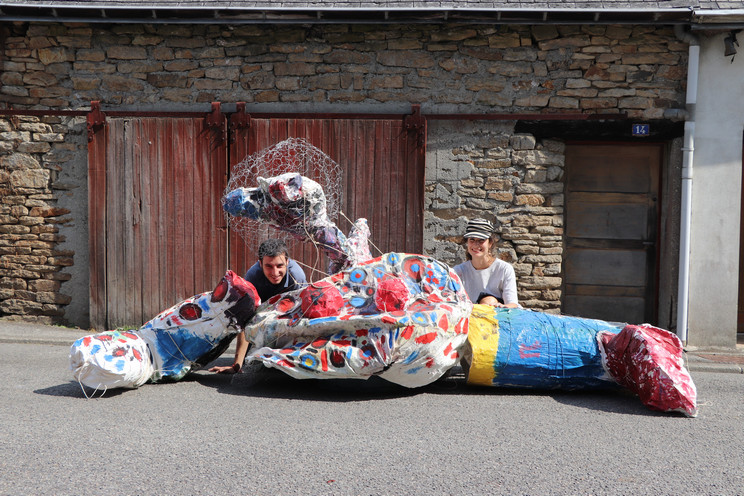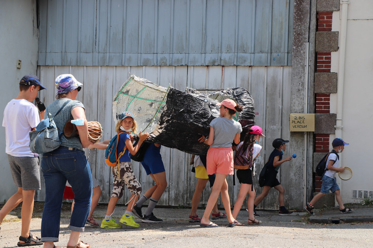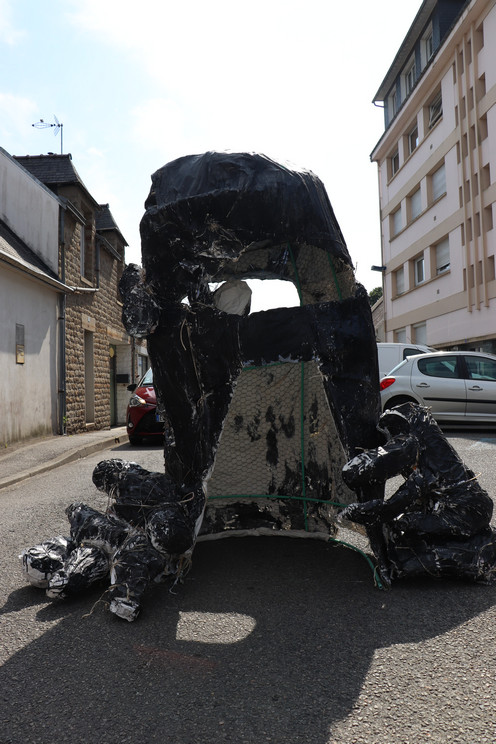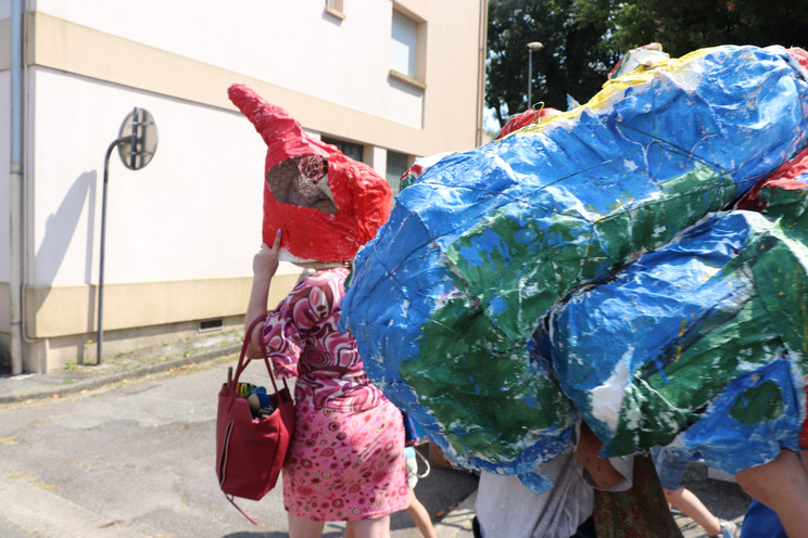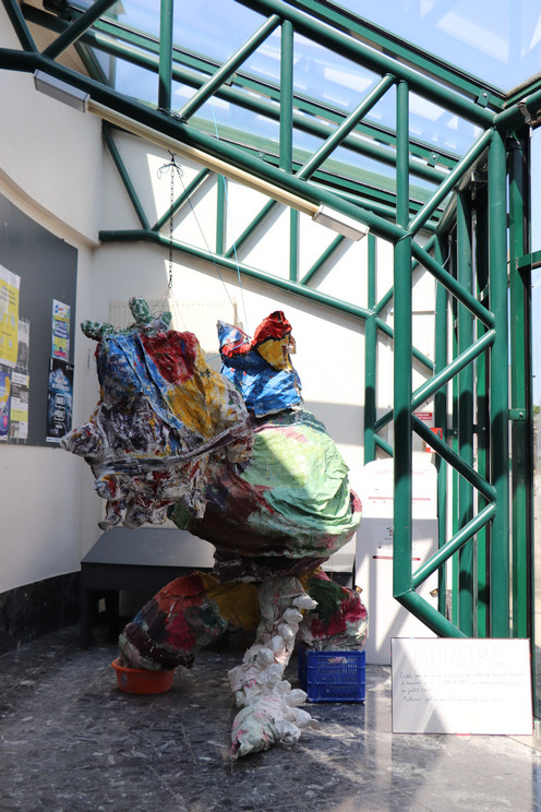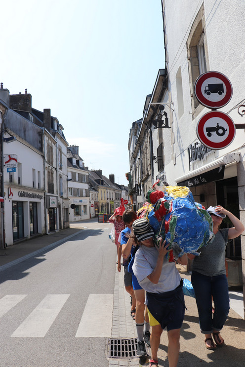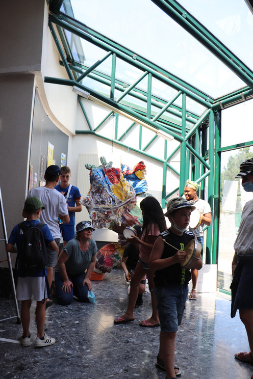 Quatrième temps : Procession et exposition dans la ville. Le 22 juillet, les trois groupes sont réunis en musique pour déplacer les monstres, séparés en morceaux, jusqu’à leur espace d’exposition dans la ville : dans le hall de la bibliothèque et du centre culturel, devant le centre social Chemins de faire, devant le centre de loisirs, dans les Jardins partagés.