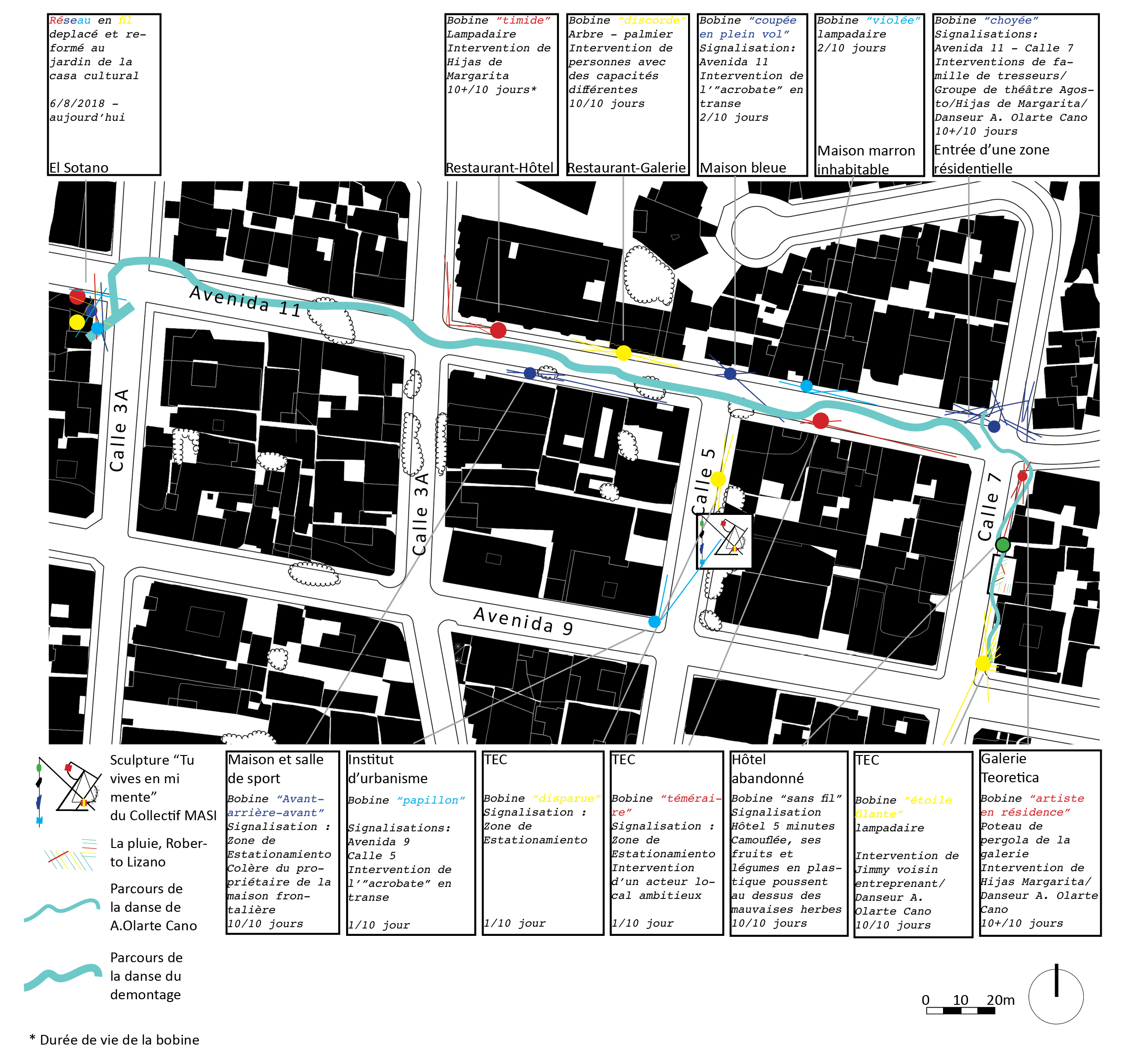 Par conséquent, aussi parce que certaines bobines mal enroulées ne tournaient pas, le réseau en fil a gardé une forme ponctuelle autour des bobines restantes. Montées sur des panneaux de signalisation, certaines sont alors – logiquement – utilisées comme repère pour donner des indications de direction. A San José les noms de rues servent peu, on nous indique le chemin en comptant des « quadras » – intersections. Ces 6 bobines-repères ont toutes eu des comportements différents, révélant en dix jours l’extrême variété du micro-quartier :