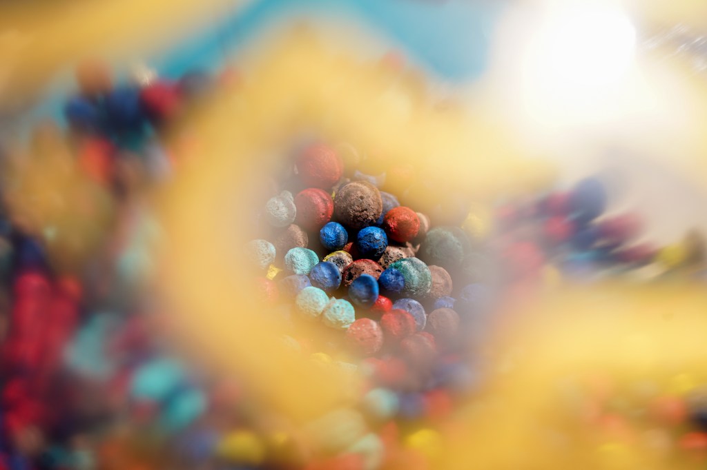 Le public la remplit d’espoir et de vie matérialisés par des billes d’argile utilisées en jardinage pour drainer l’eau. Marron – le sol, Rouge – le réchauffement climatique, Bleu – la mer, Jaune – la faune, Vert – la flore.