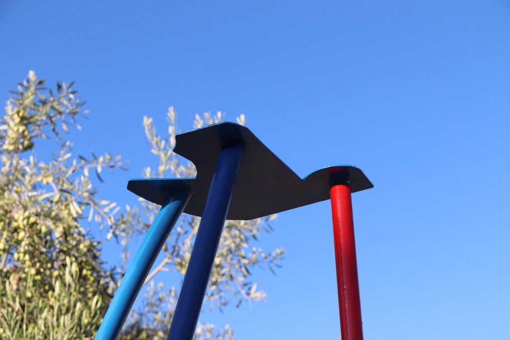 Comme portant métallique et symbolique, l’oeuvre a une base triangulaire et un oiseau au sommet, faisant sien l’adage de Dionysios Solomos “Avec logique et rêve” comme ingrédients de notre action pour la planète bleue.