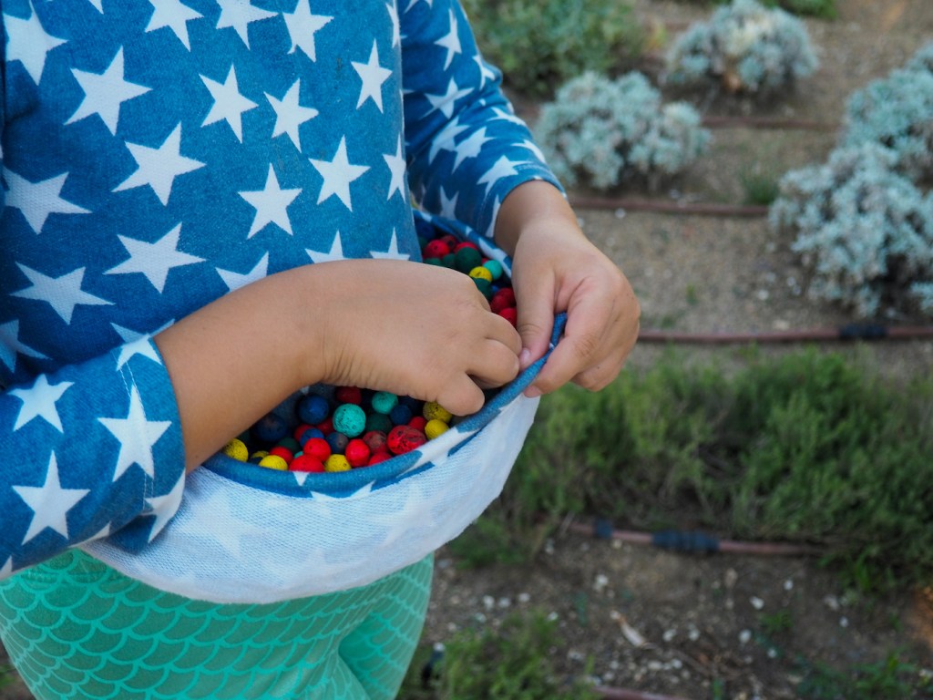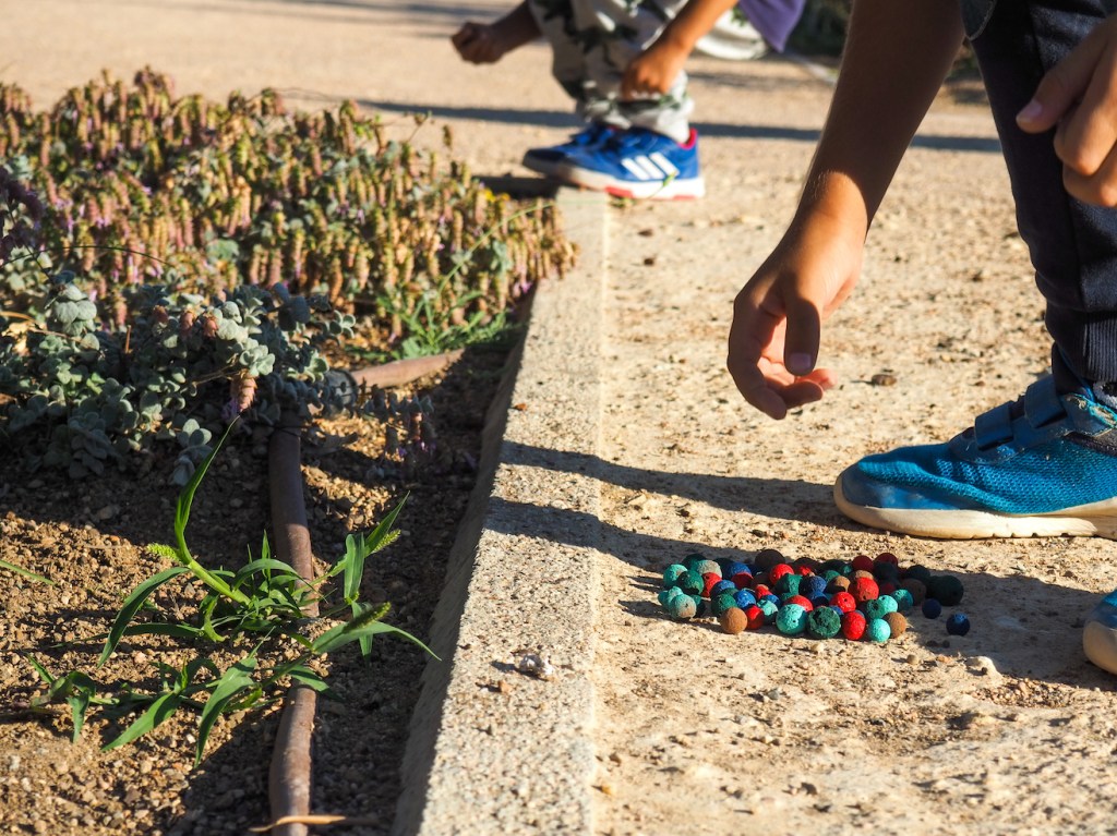 Nous avons donc caché les billes en bordure des parterres de fleurs. En se baissant, on peut les attraper sans entrer dans l’aire verte. Les enfants ont commencé à courir dans tous les sens pour les ramasser, perturbant l’équilibre du jardin. La chasse au trésor et l’exploration ludique des enfants ont dépassé les limites autorisées.