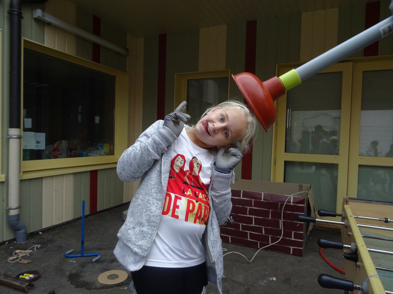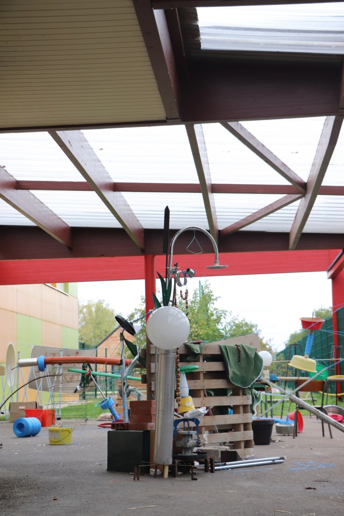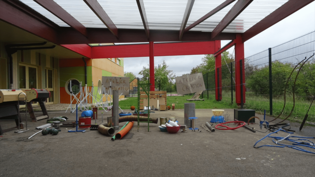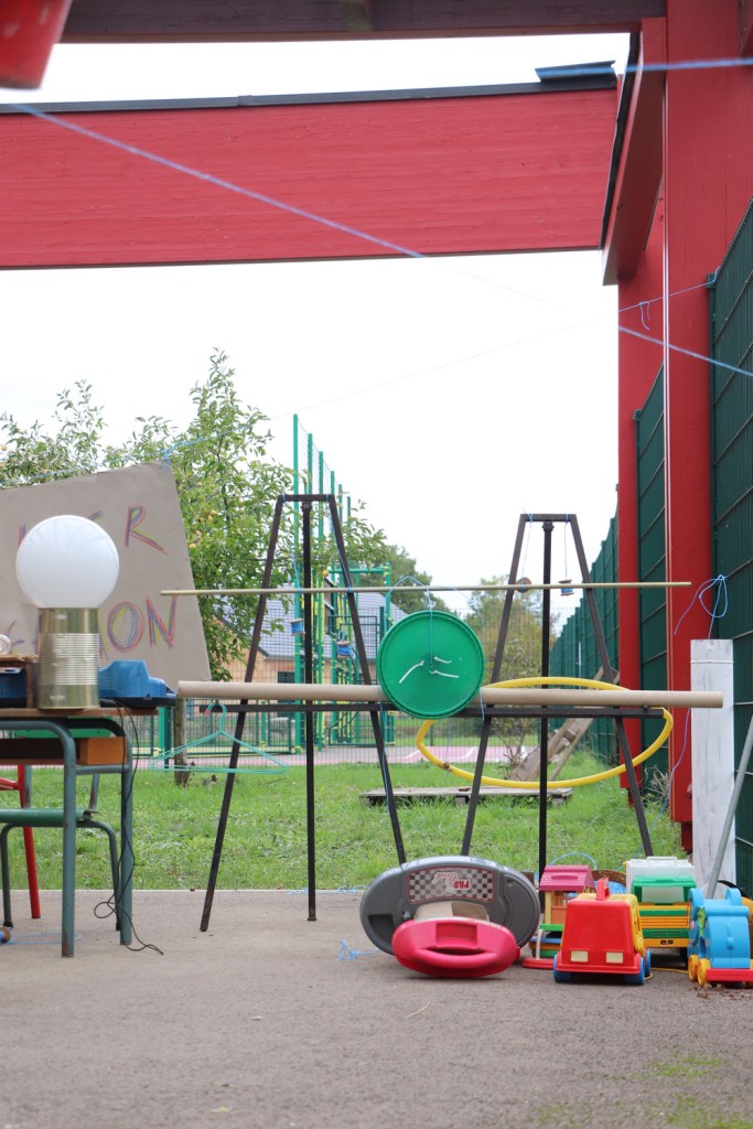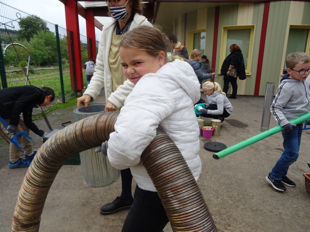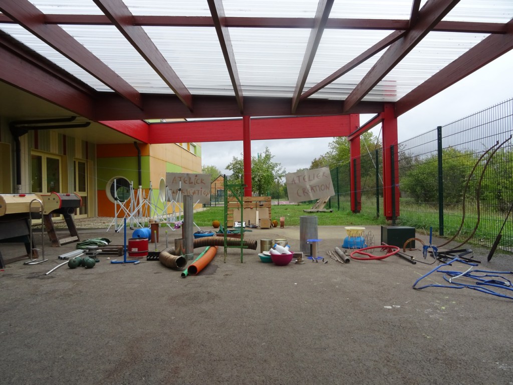 Nettoyés, désinfectés mais ni repeints ni liftés, bruts, les matériaux sont disposés sur une bande centrale séparant les deux groupes de 10 élèves. Nous-mêmes à ce moment-là sommes des boules d’appréhension, nous craignons que les enfants ne soient pas attirés par ces matériaux étranges, cassés, ou au contraire qu’ils se disputent pour le volant rouge et autres pépites, qu’ils se blessent… Simon s’imagine dans un western, un regard avec Madlen fera office de coup de sifflet. La maîtresse veille. Répétons « On ne court pas, on ne se bat pas, on travaille en groupe ».