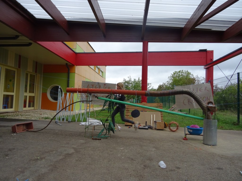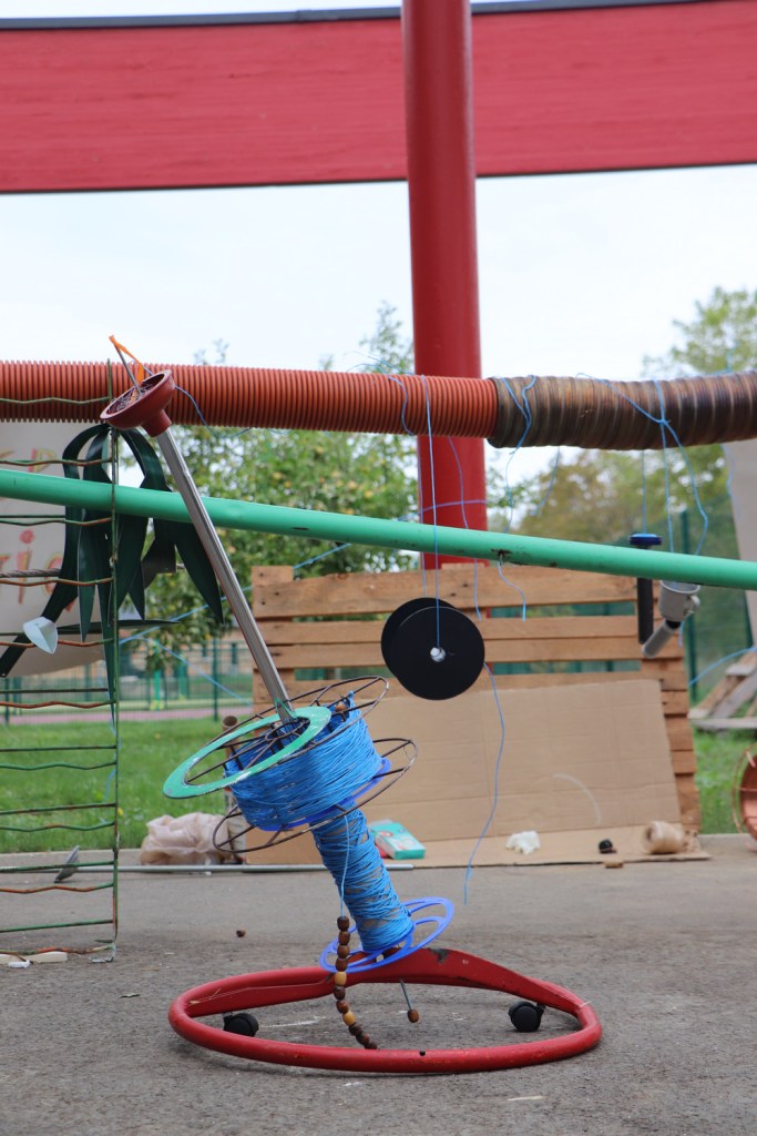 Avec le déplacement des sculptures-bobines se diffuse l’esprit de jeu dans différents espaces de l’école, comme transformée en cabane commune.