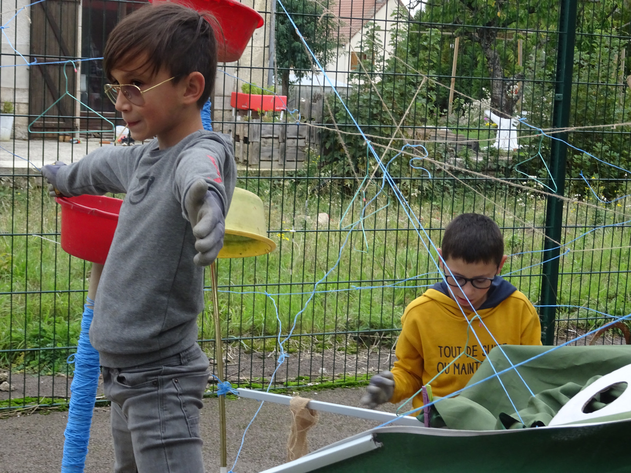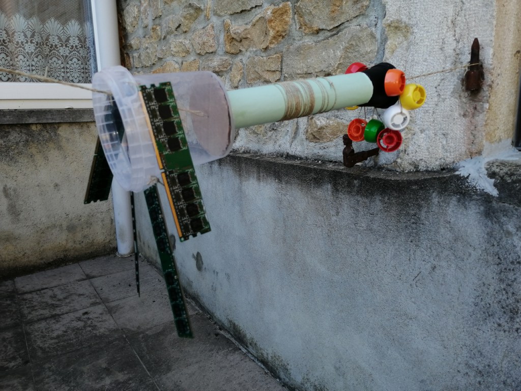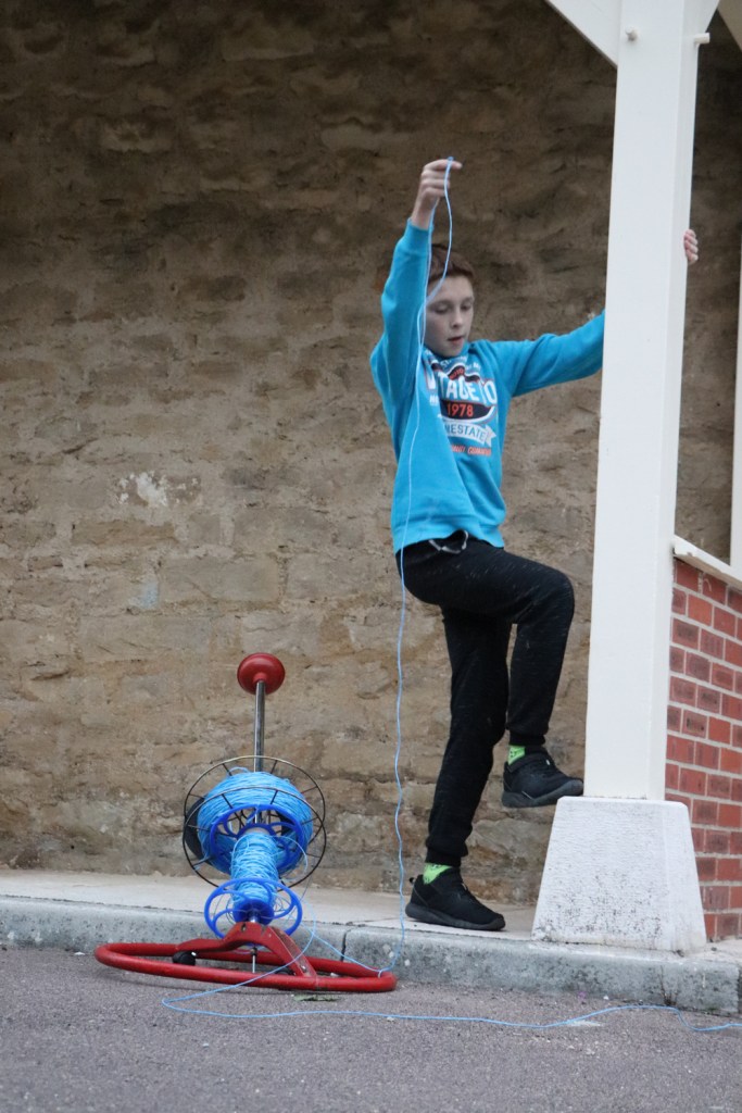 La série des Tutos « Fil et bobine » s’achève par le lancer du fil par la fenêtre, fil auquel les voisins greffent le leur dans notre cour commune. Ils envoient des photos à d’autres voisins qui réalisent un réseau en fil dans la leur. Alors à notre retour en octobre à Pouillenay, nous ne nous sommes pas contentés de transposer le protocole du réseau en fil dans l’école, et avons cherché à rallier l’espace public.