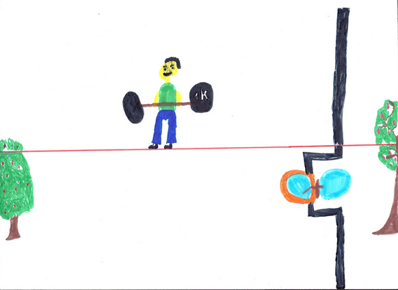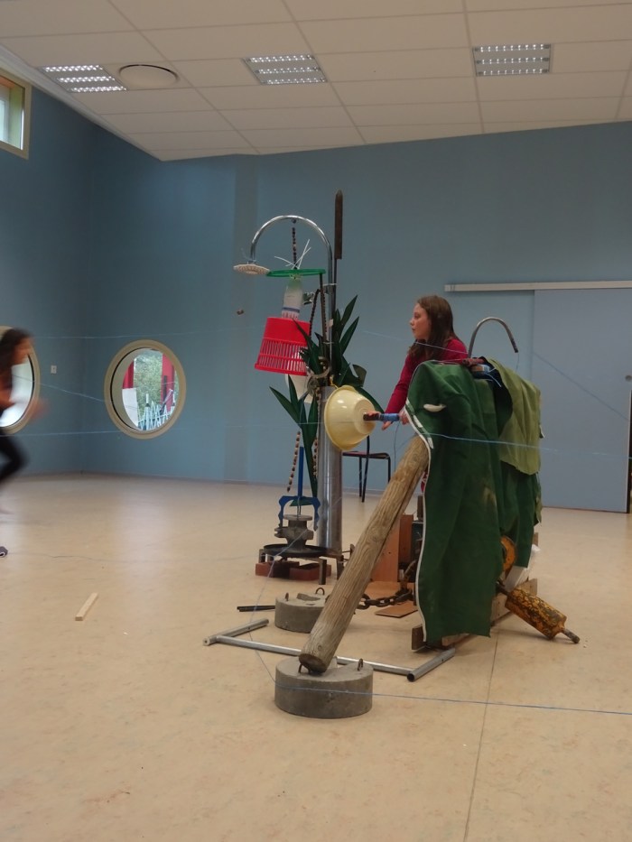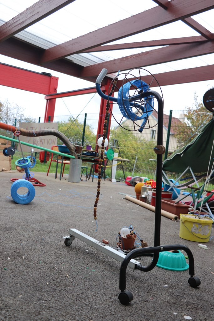 L’objectif : « On va faire une trottinette » et le duo Manon-Elinor s’y attèle, cherchant les matériaux correspondants. Nous aidons pour la statique et le roulis, évoquant notre « Arme de paix », sculpture-bobine mobile du réseau en fil de Bogota.