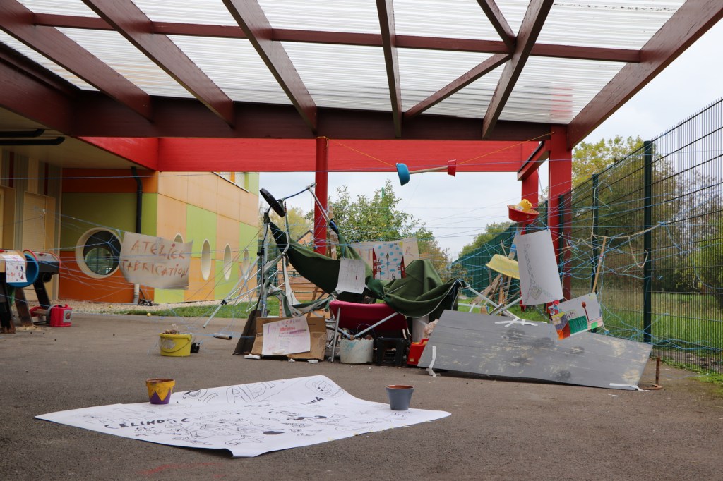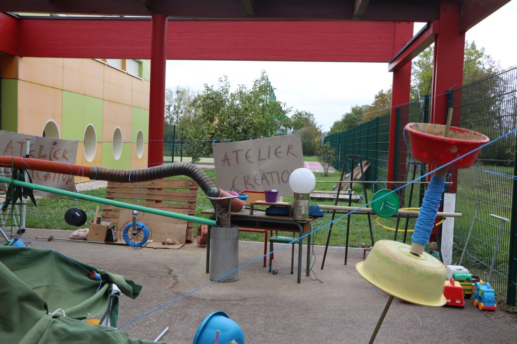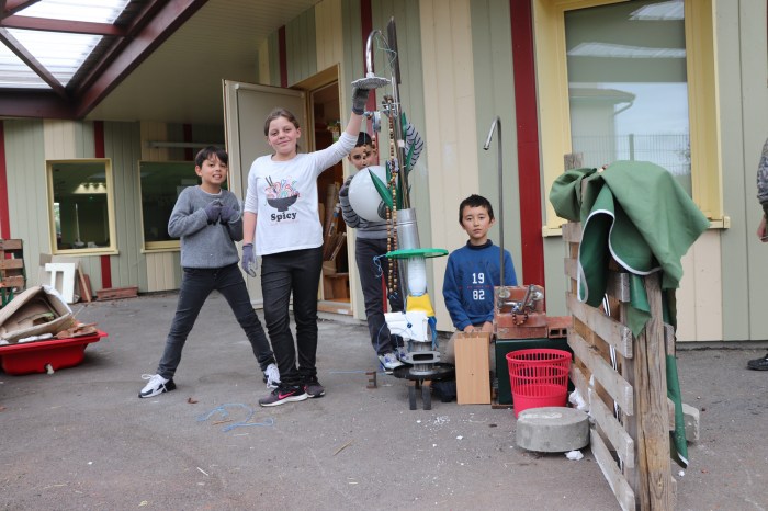 Dehors, les élèves lisent deux panneaux : « Atelier fabrication » (responsables : Madlen et Simon) et « Atelier création » (responsables les élèves-artistes).