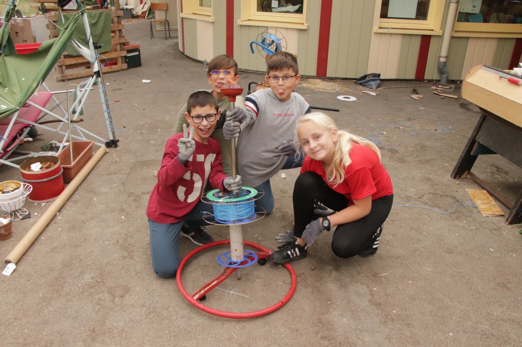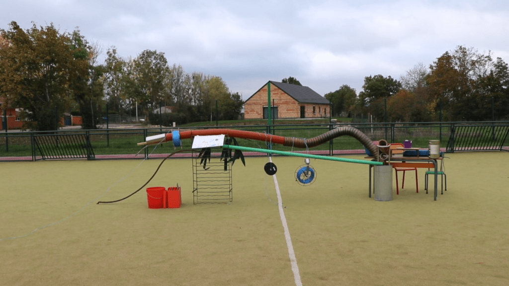 Le quatuor Tom-Pauline-Léo-Amaury part également d’un volant de cimenteuse, qu’il commence par mettre au sol puis imagine des roulettes, un axe pour une puis deux bobines…