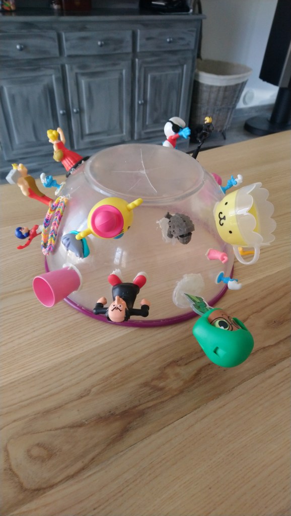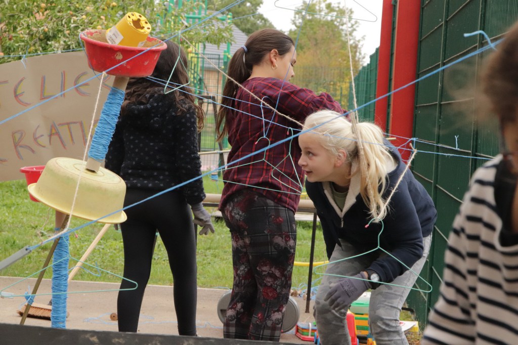 Le groupe-classe a ainsi réussi à s’exprimer avec les fils, poursuivant son œuvre collective en perpétuelle transformation tels ces fils de l’ « escape game » sans cesse descendus, remontés, déplacés…Si les sculptures-bobines ont été créées en groupe séparés avec échange de matériaux entre eux, le réseau en fil marque la mise en commun de l’oeuvre. Où toutes les sculptures appartiennent à tous les élèves qui sont libres de dérouler les fils. Cela dit l’optique de l’oeuvre collective n’est pas immédiatement acceptée, comme lorsque Romane crie « C’est. Ma. Bo. Bine ! ». Madlen lui explique qu’une fois installée la sculpture-bobine et son fil appartiennent à toutes et à tous, Romane comprend et s’ouvre.