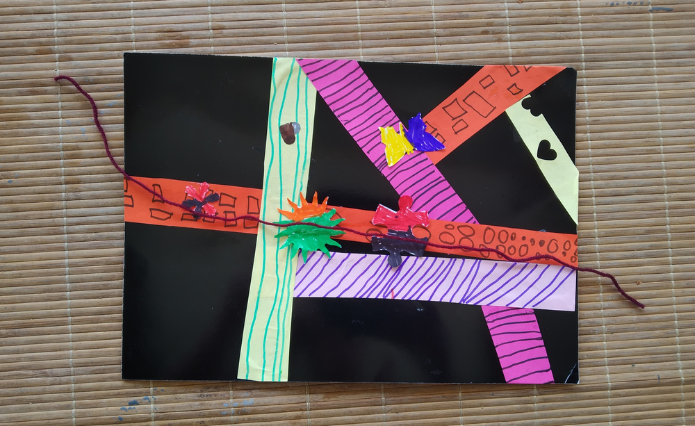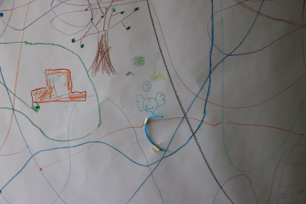Notre relation avec la classe de CM1-CM2 2019-2020 s’est tissée à distance, avec deux volets d’invitation à création transmises. Le premier anticipait la création du futur réseau en fil (création de bobines de fil), le second ouvrait les enfants à notre imaginaire, il s’agissait de dessiner un fil passant par sa fenêtre. Salomé le fait passer par l’aile d’un avion.