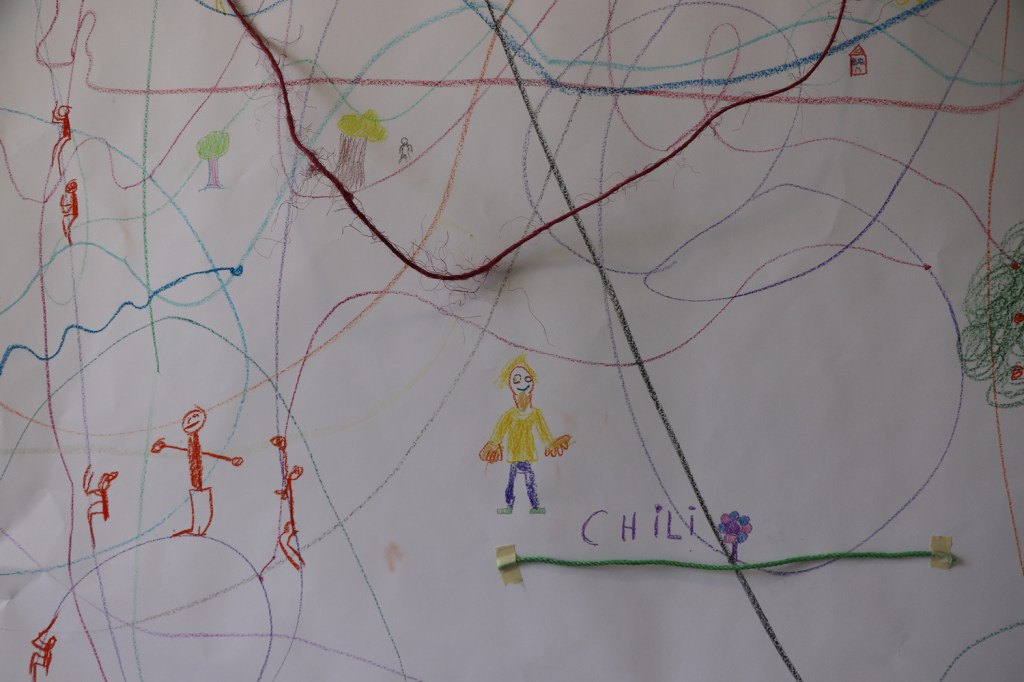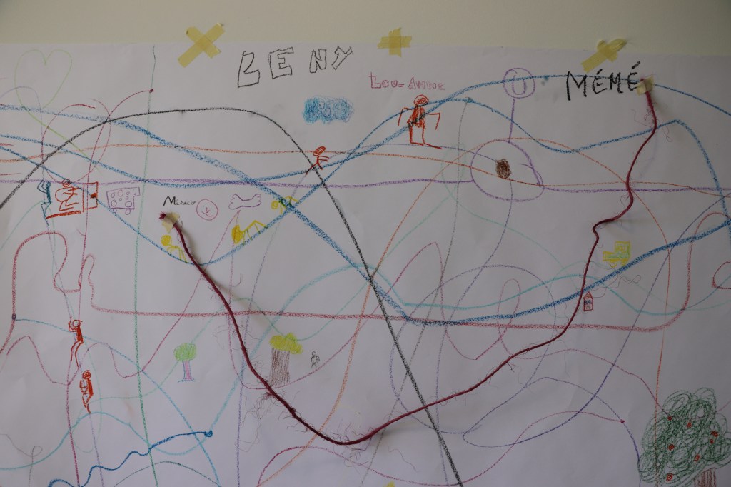 Madlen a l’idée d’inviter les élèves-conteurs à coller les fils latino-américains et à écrire leur provenance au milieu des fils traversant Pouillenay et ses environs. Partant de leurs trajets quotidiens, suivant leurs fils du doigt, ils nous content leurs aventures de réseaux en fil imaginaires qui ne connaissent pas de frontière.