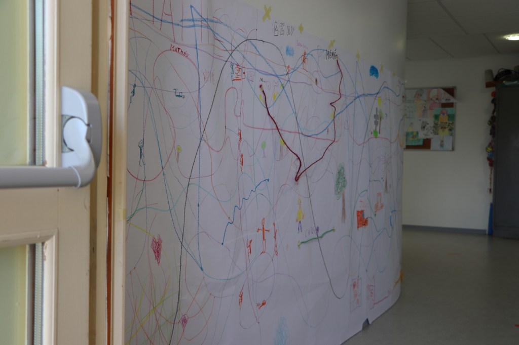 Contrainte horaire, espace limité au couloir et au terrain de sport, contacts proscrits : il s’agit alors d’adapter le réseau en fil sur un territoire imaginaire : la fresque collective. Transmettant notre méthode des scénarios imaginaires, nous invitons les élèves à peupler la page blanche une page blanche de 700x150cm suivant le mur courbe qui donne sur la sortie de secours. D’abord, une ligne chacun, qui incarne au départ leur trajet quotidien à travers le village pour venir à l’école et se transforme vite en montagnes russes. Puis des dessins des rencontres faites sur son chemin, notamment les sphères de Valparaiso et de nombreux danseurs…