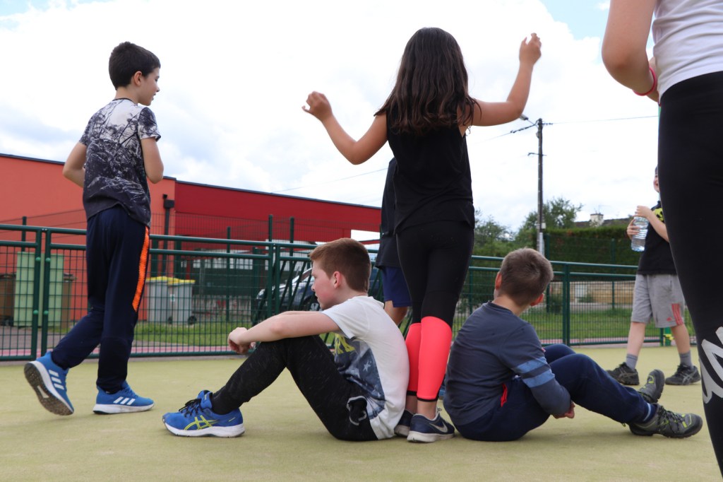 Pour la dernière séance avant notre départ, nous sortons avec les élèves sur le terrain de sport de l’école. Il fait beau, ils sont contents. Un peu de musique s’entend.