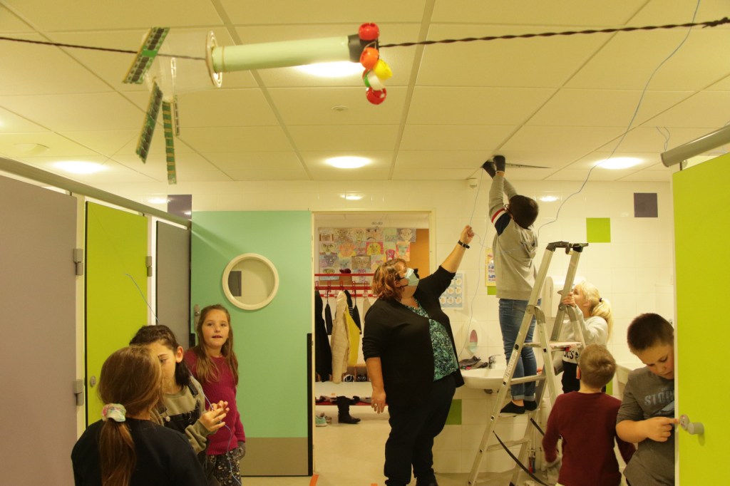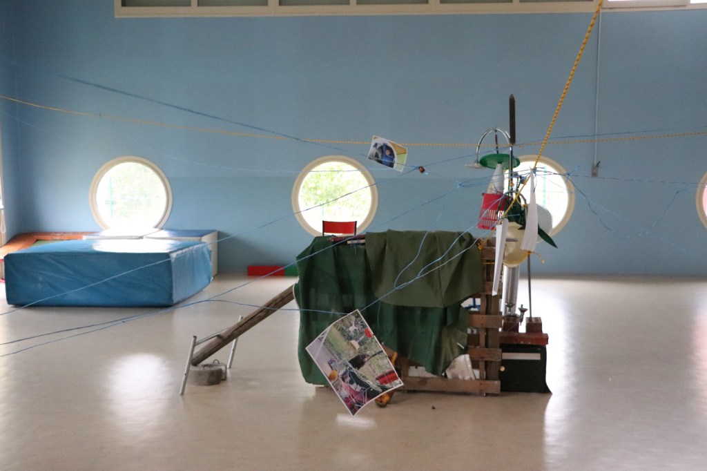 Ce passage de l’individuel au collectif est matérialisé par les dessins des réseaux en fil imaginés dans le village, qui sont suspendus aux fils dans toute l’école en compagnie de photographies du processus de création des sculptures-bobines que nous avons imprimées. Par exemple devant la Planète douche on trouve des photographies de la création de la grenade et des dessins des créateurs de la Trotta-bobina.