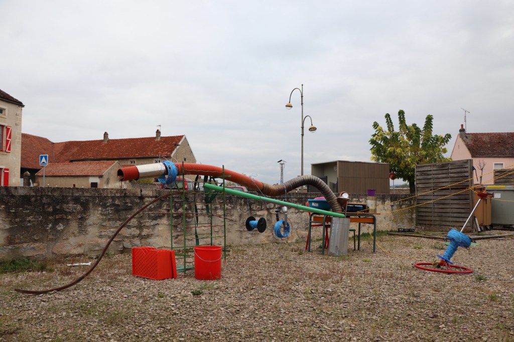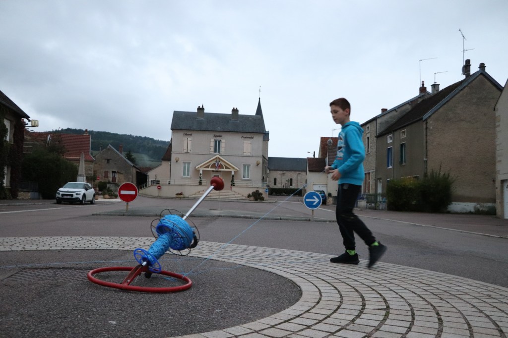 Le contraste entre un intérieur d’artiste singulier et chaleureux et un espace public de carte postale vide est saisissant. Il se retrouve à Pouillenay même, où avec l’accord final du maire les sculptures-bobines des élèves sont sorties et installées sur la place du Macarena, hôtel-restaurant au centre du village. Nous installons également les pancartes explicatives créées par les enfants à l’aide de fil. Un café et un chocolat chaud nous permettent d’annoncer l’exposition au personnel de l’établissement qui, surpris, nous assure qu’il passera le message.