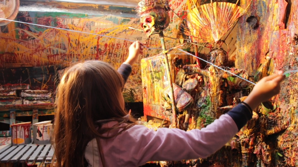 Artistes à la philosophie de « Maîtres ignorants » (Rancière, 1987), nous considérons les élèves comme des artistes dont nous avons beaucoup à apprendre. Sous le préau, dans leur atelier-cabane, chaque groupe d’élève-artiste se prête au jeu de l’entretien face à la caméra, où il nous raconte la vie de sa création.