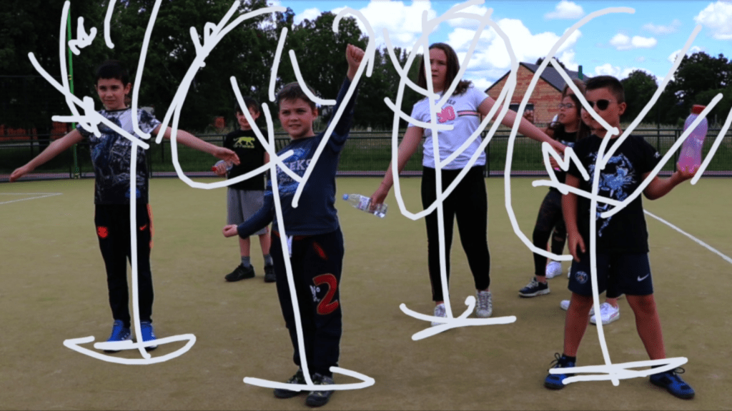 Le protocole sanitaire ne proscrit plus les contacts physiques entre les élèves, mais cette fois nous n’avons pas apporté de fil. Nous amenons les enfants à reprendre face caméra les gestes qu’ils ont retenus des vidéos des réseaux en fil d’Amérique latine. Puis en groupe ils jouent des scènes, certains font les photographes avec leur bouteille d’eau, d’autres s’assoient dos à dos, naît une fontaine.