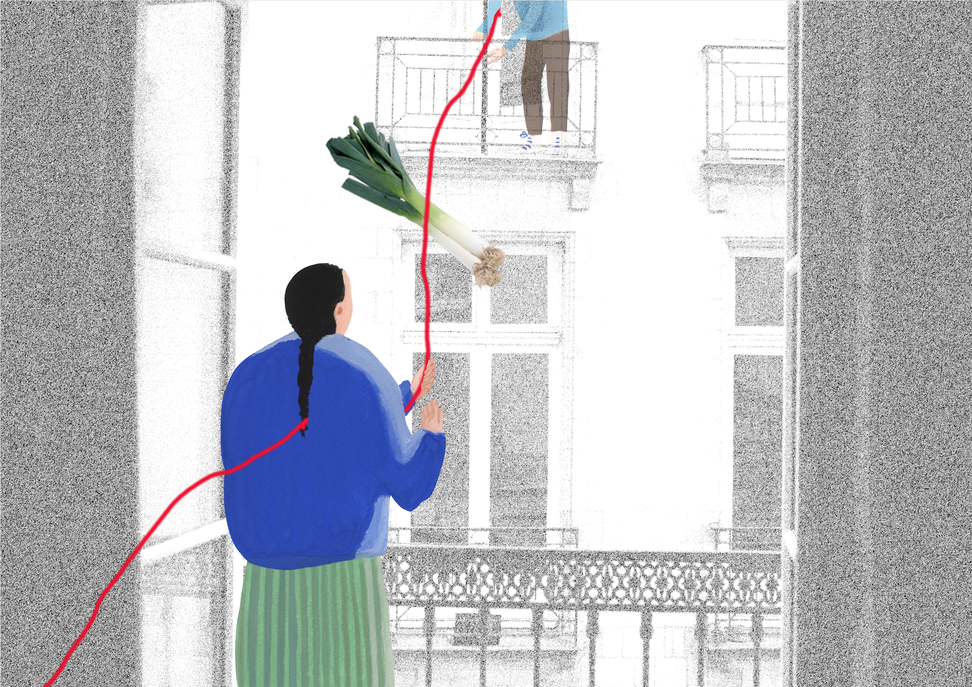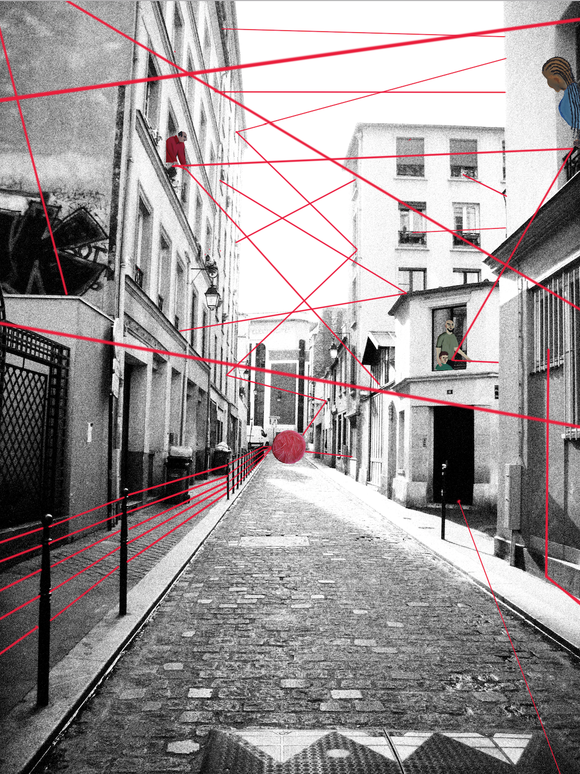 Alors les acteurs locaux peuvent s’approcher des sculptures-bobines et dérouler les fils, les faire passer par des espaces publics à l’aide d’éléments urbains comme des poteaux, des arbres, des bancs. Et, avec l’accord des habitants, ils pourront pénétrer des espaces privés comme des balcons, de fenêtres, voire l’intérieur des habitations. Les scénarios seront spontanés et dépendront des réactions locales. Le réseau pourra être étendu par des greffes de fils de toutes sortes par les habitants et les passants, fil à linge, cables électriques, lacets…