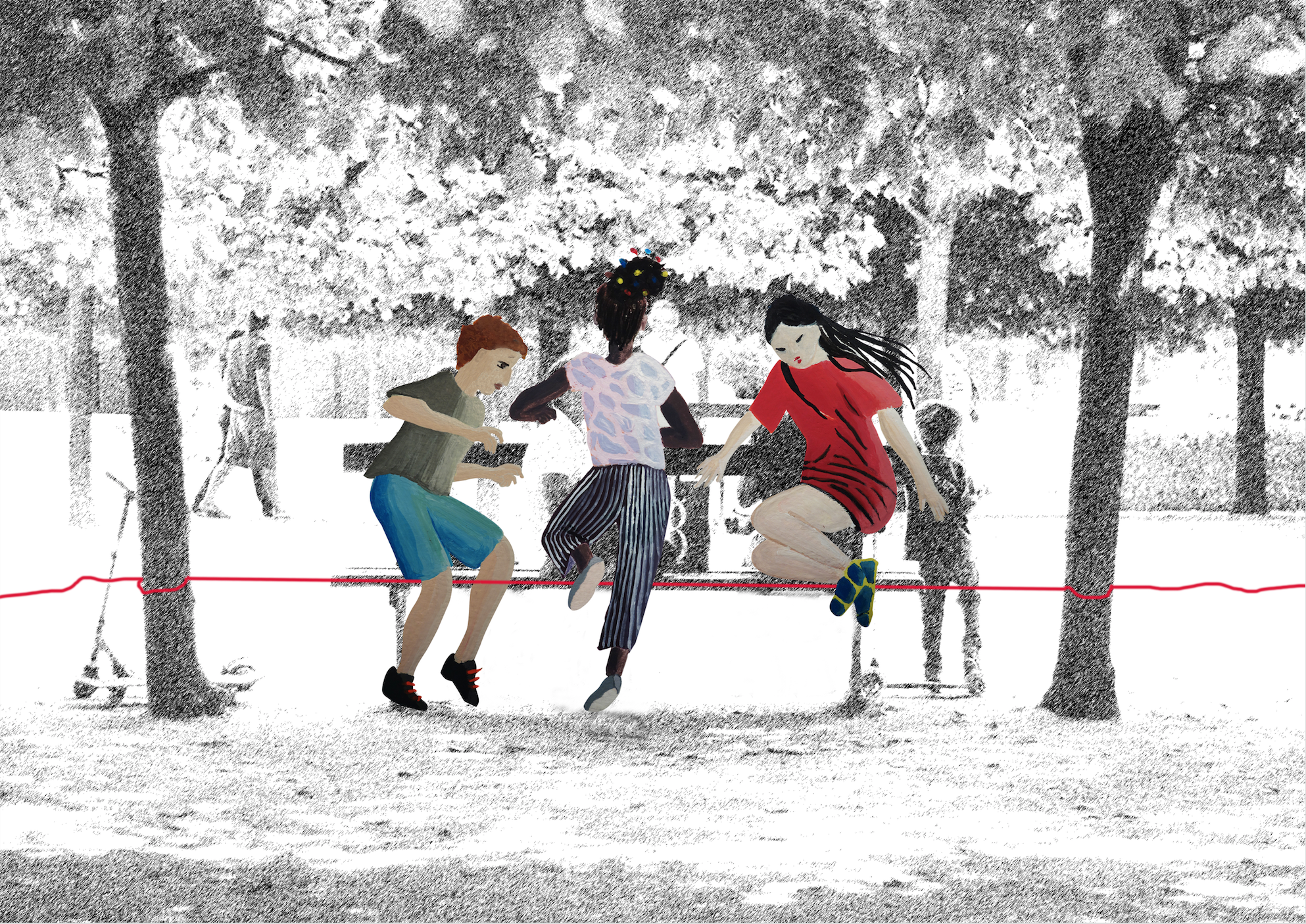 La ville est déjà tissée par de nombreux réseaux, des rues, de l’électricité, de l’eau… Géographiques, historiques, sociaux, symboliques : les liens sont protéiformes et les représenter requiert une matière plurielle. En même temps, cette matière doit maintenir une certaine unité, un équilibre entre passé et présent, entre différentes générations, une continuité ouverte sur l’avenir, respecter le bâti et susciter du mouvement. Ces exigences donnent du fil à retordre, et pour accomplir ce travail de funambule, il nous faut filer la métaphore et, tout simplement, utiliser du fil !