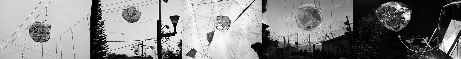 Lima et l’Acrobate* : des fils verticaux lancés par les habitants à cheval sur les fils horizontaux tels des funambules lestés par des jouets en plastique remplis de sable.